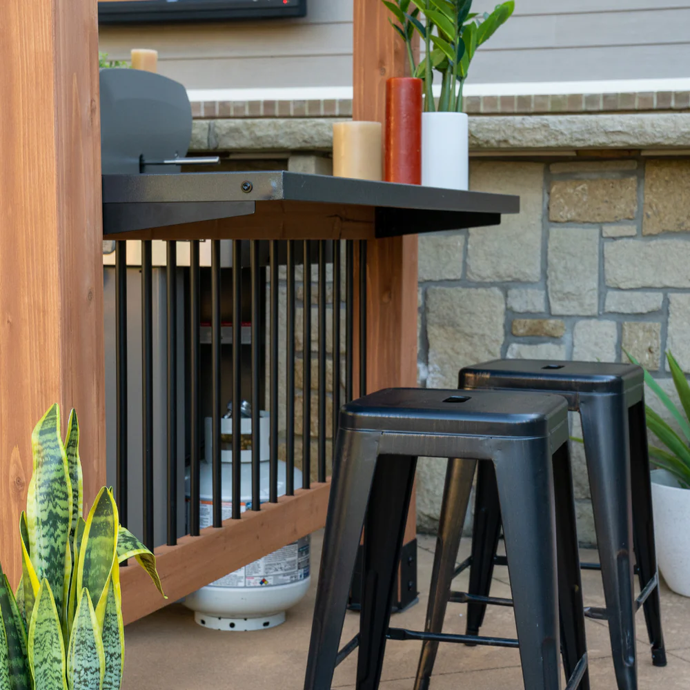 The interior is genuinely spacious enough to fit two standard grills side by side, or a combination of a griddle and smoker, giving serious outdoor cooks the room and flexibility to run multiple cooking stations at once. Two built-in 16-inch powder-coated galvanized steel countertops provide durable, rust-resistant prep and serving surfaces on both sides of the structure, and ten moveable magnetic accessory hooks keep grilling tools, mitts, and utensils organized and within easy reach without cluttering the countertops. The patented PowerPort with three 120V electrical outlets and three USB ports mounts directly to any post, keeping blenders, speakers, lighting, and other electronics powered throughout cooking and entertaining sessions without running extension cords across the patio.