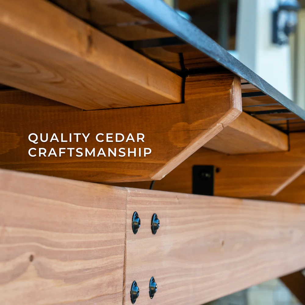 Pre-cut, pre-drilled, and pre-stained cedar components paired with step-by-step 3D interactive instructions through the BILT app make assembly manageable as a weekend project, and mounted steel anchoring plates provide ground stability while protecting the wood from moisture contact. Currently on sale at $1,199 from a regular price of $1,599, it represents strong value for a cedar and steel grill gazebo at this size and build quality level.