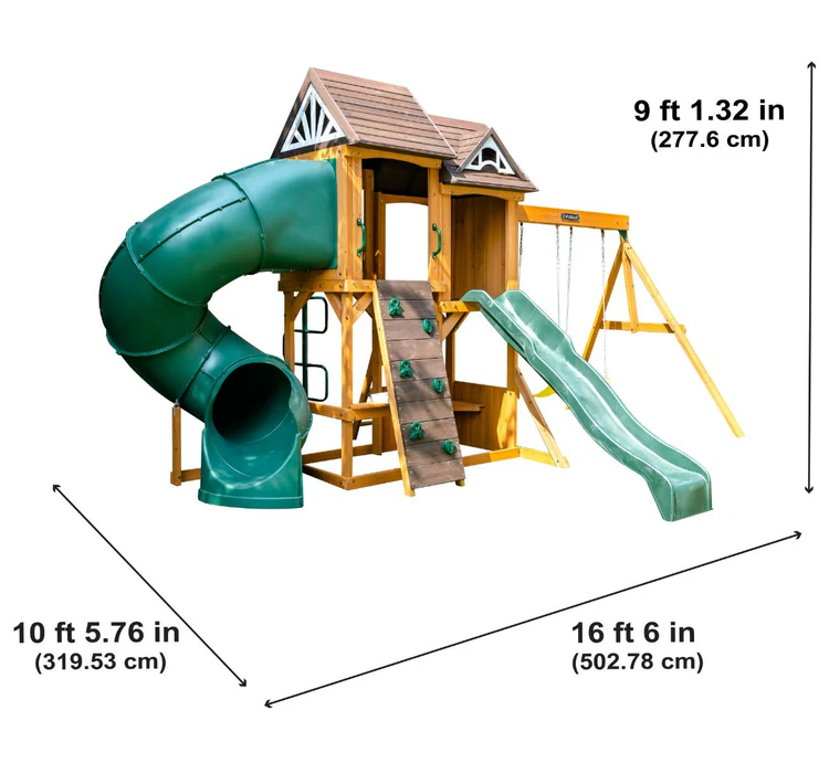 Constructed from high-quality Cunninghamia Lanceolata wood from the cypress family, known for its light weight and excellent structural strength, the Laurel Retreat is built for long-term outdoor durability across multiple seasons of active use. Seven rebar ground stakes are included to anchor the playset securely in place, and the structure fits within a safety zone of approximately 29.5 by 23.5 feet. Professional assembly service is available as an optional add-on for families who prefer a hands-off installation, and assembly instructions are provided in English, French, and Spanish.