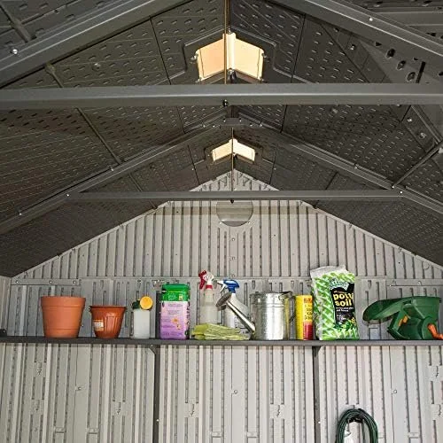 Integrated ventilation panels help maintain airflow inside the shed, reducing moisture buildup and improving overall storage conditions. Skylights and windows allow natural light to enter the interior, making it easier to locate tools and equipment during the day.