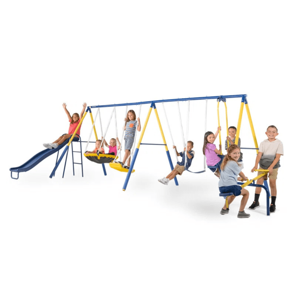 Built with durable, rust-resistant metal, this bright and colorful blue-and-yellow swing set is engineered for safety, stability, and long-lasting use. It’s the perfect backyard playground solution for families looking to encourage active outdoor play while making lifelong memories together.