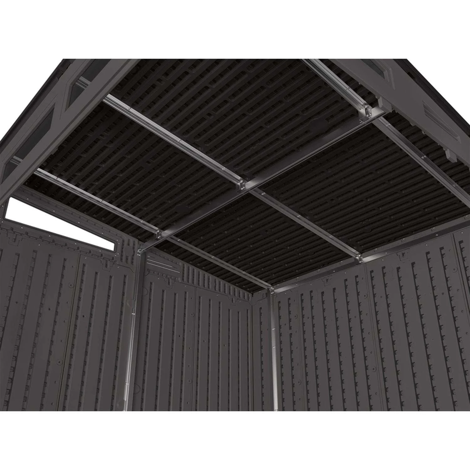 With 317 cu. ft. of storage space, the 7ft x 7ft Modernist Storage Shed by Suncast is ideal for storing all your outdoor equipment, whether a small or large. The reinforced resin floor is built to withstand heavy loads, including tractors, mowers and other lawn or outdoor equipment. Sturdy double doors allow you to access your items easily, and is equipped with pad-lockable metal handles (resin handle, metal slide latch) for added security (lock not included). The metal reinforced, multi-wall resin panel construction provides additional strength and stability to the unit to withstand the elements all year long.