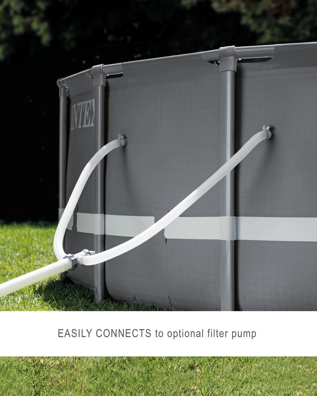 The Intex Ultra XTR® Frame Above Ground Pool (18′ x 52″) is a high-end above ground pool designed for people who want a clean, modern backyard setup without dealing with the cost or commitment of an in-ground installation. It stands out with its sleek graphite exterior and blue tile interior print, giving it a more polished look than typical above ground pools. The structure is built using galvanized steel with both inner and outer powder coating, which helps resist rust and wear over time, while the reinforced frame design keeps everything stable even with heavy use.