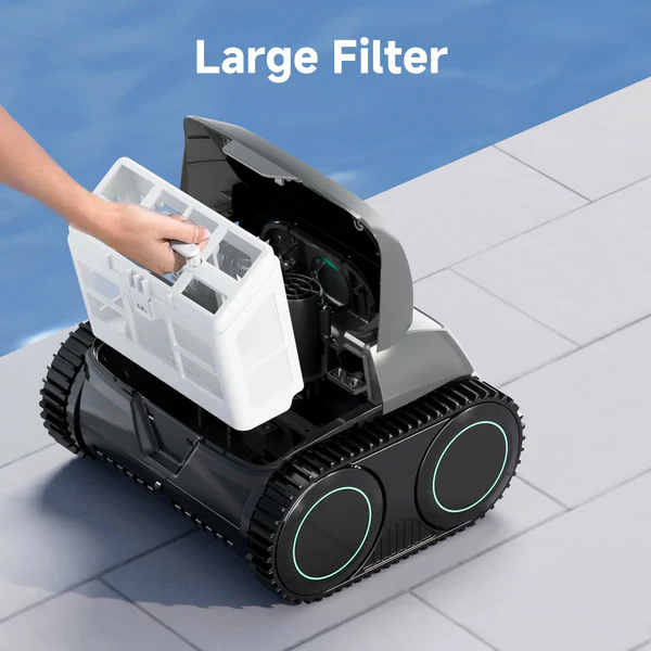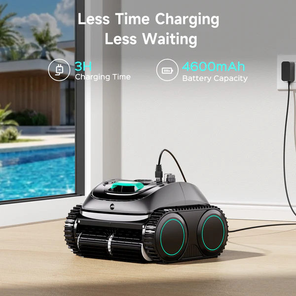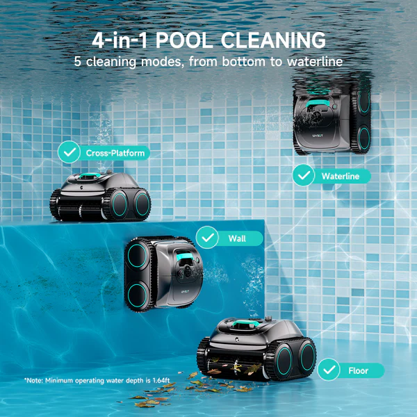 The WYBOT C1 is a 2026 upgraded cordless robotic pool cleaner designed to take the manual labor out of pool maintenance entirely, handling floors, walls, waterlines, steps, and slopes automatically across pools up to 1,615 square feet. Running on battery power with up to 150 minutes of runtime per charge and a 3-hour recharge time, it operates completely independently without any cables to manage or tangle, making it compatible with all pool shapes including both above ground and in-ground installations across surfaces like cement, vinyl liner, and mosaic tile down to a maximum depth of 9.8 feet.