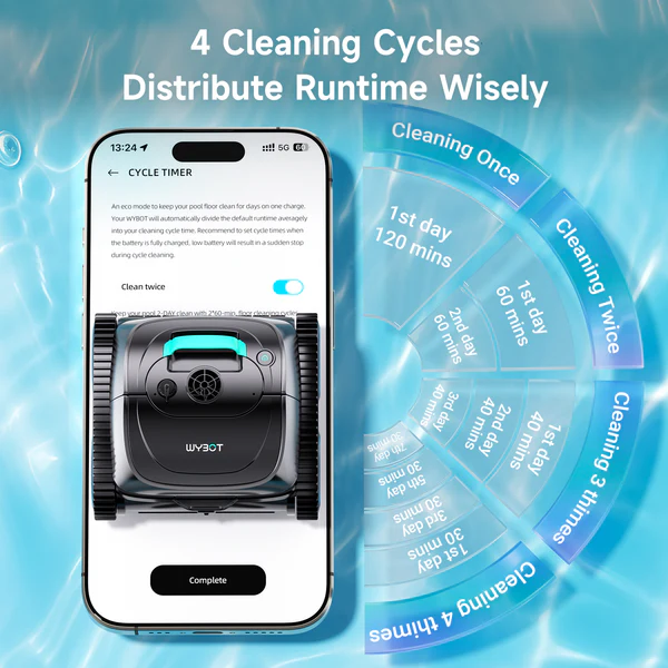App connectivity through the WYBOT application adds a meaningful layer of convenience, allowing users to customize cleaning modes, schedule up to four automatic cleaning cycles per week, and receive over-the-air firmware updates to keep the robot’s software current. The IPX8 waterproof rating confirms the unit is built for full submersion, and for homeowners who want comprehensive surface and waterline coverage it pairs well with the WYBOT F1 solar-powered surface skimmer for a complete automated pool care system that handles both subsurface and surface debris simultaneously.