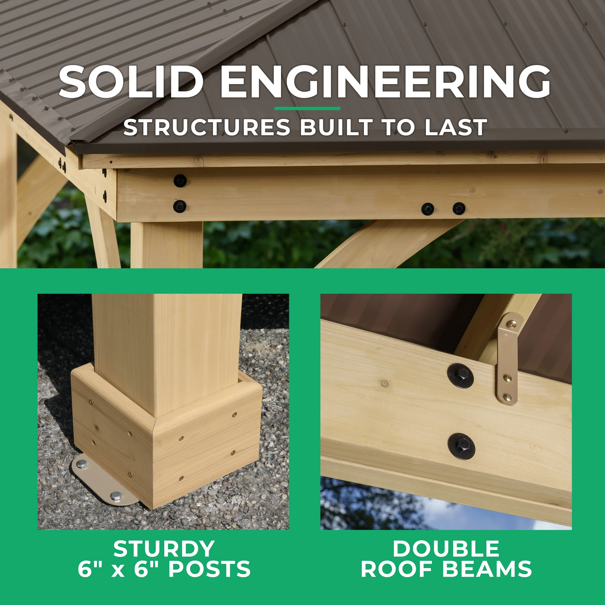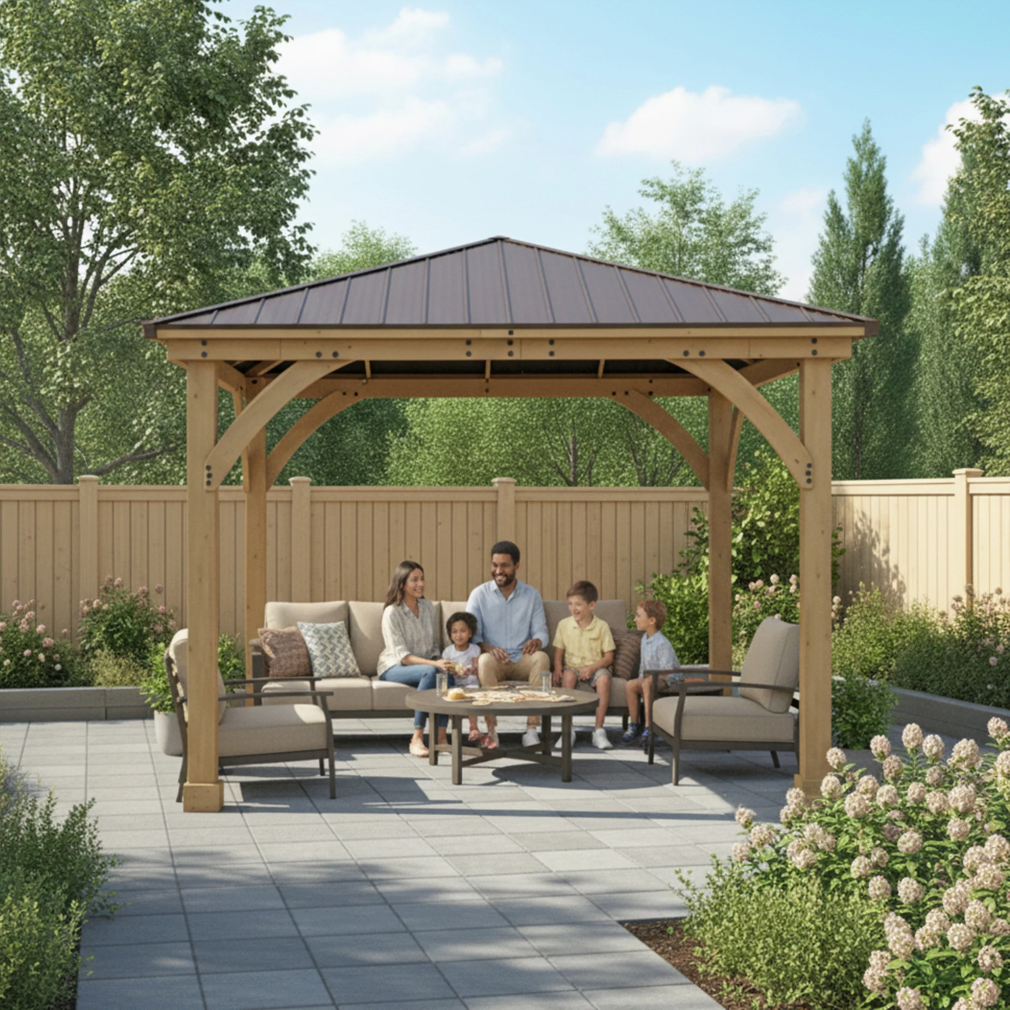 The Yardistry 12×12 Meridian Gazebo is a premium cedar and aluminum outdoor structure designed to elevate any backyard or patio into a polished, permanent entertaining space. Built entirely from 100 percent premium cedar lumber finished with a beautiful natural cedar stain, it brings warmth, character, and a distinctly upscale feel that pressure-treated pine or composite alternatives simply cannot replicate. The rust-proof coffee brown aluminum roof is lightweight yet highly durable, providing long-term weather resistance without the weight or maintenance demands of steel roofing, and the stunning visual contrast between the warm cedar frame and the clean aluminum roof creates an architectural aesthetic that stands out in any outdoor setting.